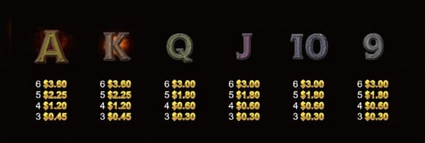低配当シンボルはA・K・Q・J・10・9のトランプ文字6種類です。3個以上の出現で配当が成立し、6個揃いで最大$3.60の配当です。