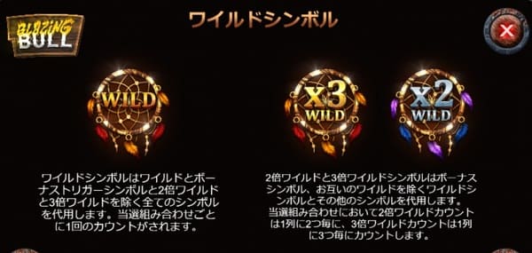 ブレイジングブルには3種類のワイルドシンボルがあります。ドリームキャッチャーのデザインが特徴的です。
