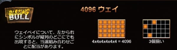 ブレイジングブルでは、左端のリールから右へ、隣接するリールに同一シンボルが2個以上出現すると配当が成立します。 4096ウェイ方式のため、どの段に出現しても問題ありません。上の画像ではワイルドシンボルがリールの中央に出現し、配当が成立しています。