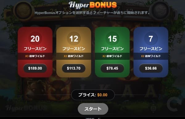 Hyper Bonus機能で4つのオプションから選べます。最安はx2ワイルド付き7回で約$36.66(ベット額の約61倍)、最高はx3ワイルド付き20回で$189(ベット額の約315倍)です。