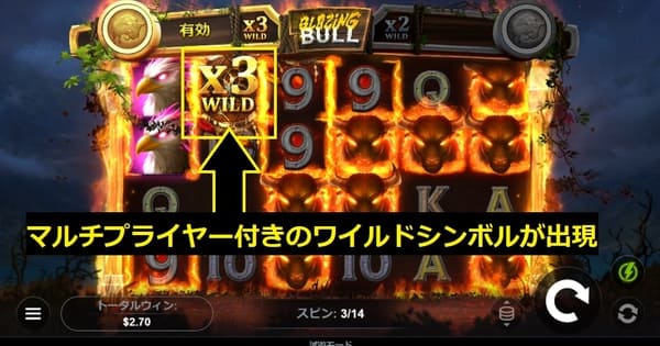 フリースピン中にマルチプライヤー付きのワイルドシンボルが出現します。 上の画像ではx3ワイルドがリール上に出現し、配当に含まれる場合はその配当が3倍になります。 炎の雄牛シンボルなどの高配当シンボルと組み合わさると、大爆発につながります。