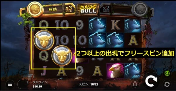 フリースピン中にボーナスシンボル(雄牛のコイン)が2つ以上出現するとフリースピンが追加されます。 追加スピンにもマルチプライヤーワイルドが出現するため、延長されるほど大きな配当のチャンスが広がります。