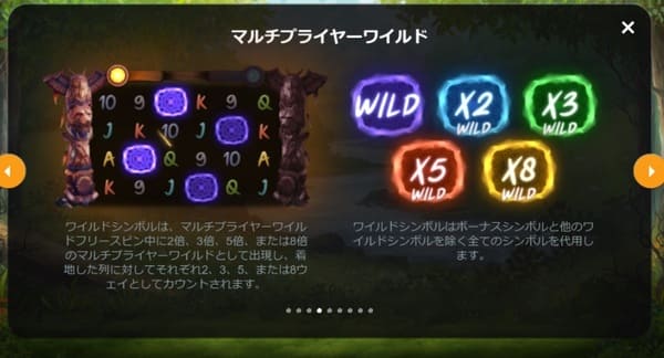 通常ワイルド・x2ワイルド・x3ワイルドの3種類があります。マルチプライヤーワイルドはフリースピン中にx2、x3、x5、x8倍のマルチプライヤーとして出現します。