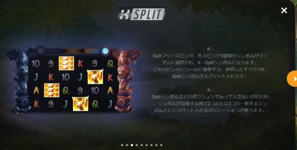 K-Splitフリースピンは通常のフリースピンとは異なる特殊モードです。 トーテムポールが両側に立つ独特の画面で、BOOST機能が加わり、各スピンで選ばれたK-Splitシンボルが分裂して配当チャンスが大幅に増加します。