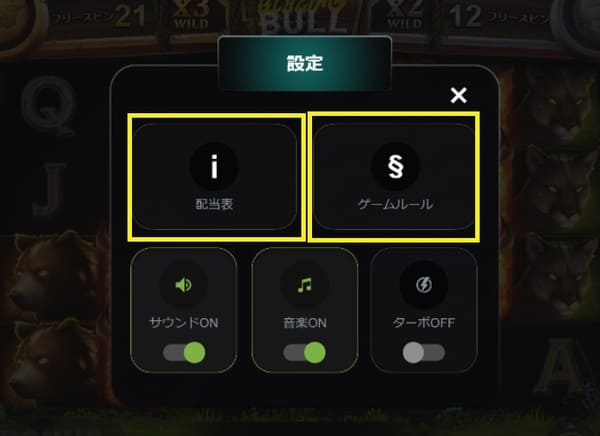 画面左下のハンバーガーメニュー(≡)をタップすると設定画面が開きます。 「配当表」で各シンボルの価値を、「ゲームルール」で詳細なルールを確認できます。 サウンド・音楽のON/OFFやターボモードの切り替えもここで設定可能です。