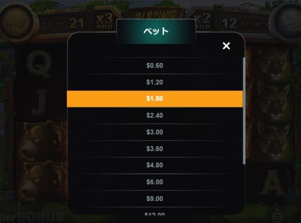 画面中央下のベットボタンをタップすると、ベット額のリストが表示されます。 $0.60から$90まで複数のベット額が用意されており、タップするだけで簡単に切り替えられます。