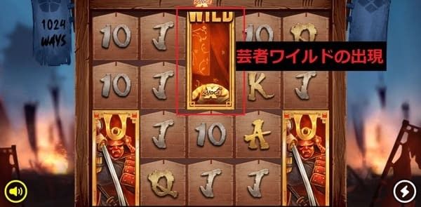 高配当シンボルは3種類の侍(赤・緑・金)と武具です。芸者はワイルドシンボルとして機能し、すべてのシンボルの代わりになります。低配当シンボルはA・K・Q・J・10の木札文字です。