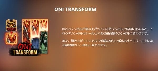 鬼トランスフォームは、ボーナスシンボルが積み上がっている侍シンボルと同時に出現すると発動します。それらのシンボルはリール上にある最高額のシンボルに変換されます。さらに、積み上がっているより低額な侍シンボルもすべて最高額シンボルに変わるため、一気に大量の高配当シンボルが出現する可能性があります。