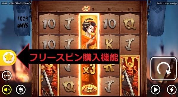 画面左の星アイコンをタップすると、ゲイシャスピン(フリースピン)を購入できます。価格はベット額の約70倍です。購入すると即座にフリースピンに突入し、xNudgeワイルドが活躍する高配当チャンスが始まります。