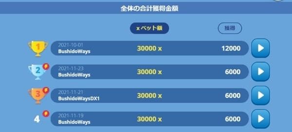 実際のプレイヤーによる最大30,000倍の配当が複数回達成されています。上の画像では30,000倍の配当が4回以上記録されており、$12,000(約180万円)を獲得した例もあります。武士道ウェイズの爆発力の高さを物語っています。