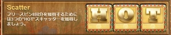 H-O-Tの3文字がスキャッターシンボルです。 エクストラリール(メインリール下部の水平リール)にH・O・Tが揃うとフリースピンを獲得できます。