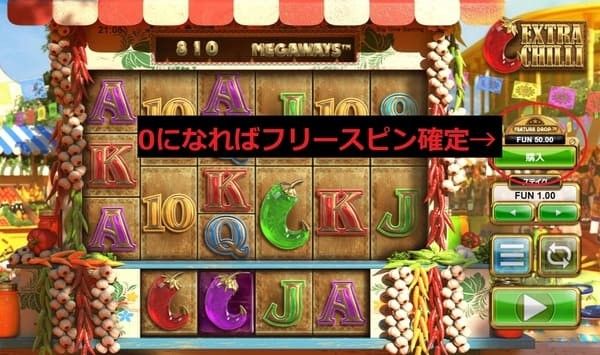 エクストラチリは高ボラティリティのスロットです。FS購入50倍を複数回行える資金を確保してから挑みましょう。 最低でも10回分(ベット額の500倍)の資金があると、安心してプレイできます。