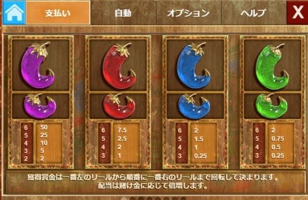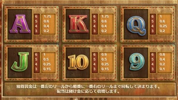 低配当シンボルはトランプの文字(A・K・Q・J・10・9)です。6個揃い時の配当は以下の通りです。