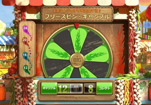 エクストラチリ最大のユニーク機能がこのギャンブル機能です。 フリースピン獲得後(HOT揃い or FS購入後)にギャンブル画面が表示されます。