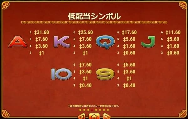 低配当シンボルはA・K・Q・J・10・9のトランプ文字6種類です。中国風の装飾が施されたカラフルなデザインが特徴です。6個揃いで最大$31.60($5.60ベット時)です。