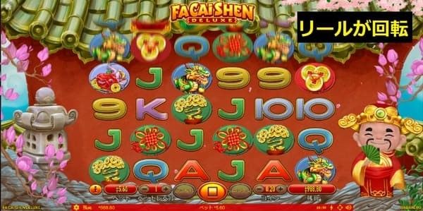 財神(Fa Cai Shen)キャラクターがリール上部に出現し、ワイルドシンボルとして機能します。リール上のシンボルをワイルドに変換したり、追加のワイルドを配置したりする特殊効果を発動します。