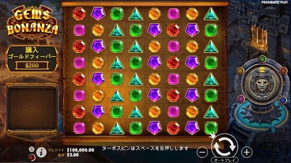 ジェムズボナンザ(Gems Bonanza)は、Pragmatic Play社が提供する8×8グリッドの大型クラスターペイスロットです。 宝石と古代遺跡をテーマにした美しいビジュアルが特徴で、64マスの広大なグリッド上で隣接する同一シンボルが5個以上揃うと配当が成立します。 複数のランダムフィーチャーとゴールドフィーバー(フリースピン)により、最大10,000倍の爆発力を秘めています。
