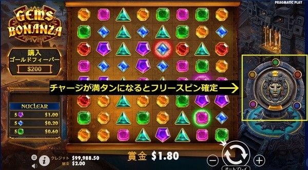 画面右側に配置された石像型のチャージメーターがジェムズボナンザの特徴的な要素です。 配当が成立するたびにメーターがチャージされ、満タンになるとゴールドフィーバー(フリースピン)が発動します。
