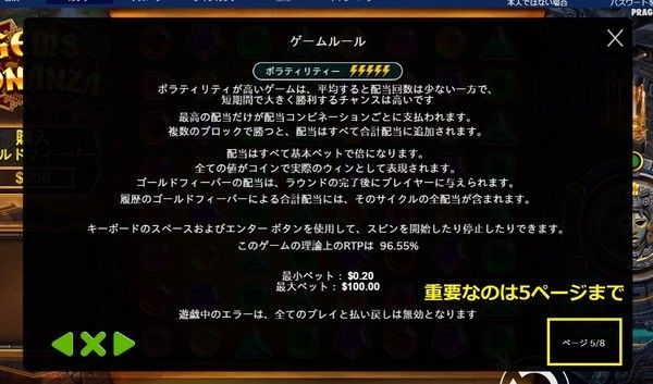 ゲームルール画面では、各シンボルの配当やフィーチャーの詳細を確認できます。 初めてプレイする際は、まずルールを確認して各シンボルの価値と配当条件を把握しておきましょう。