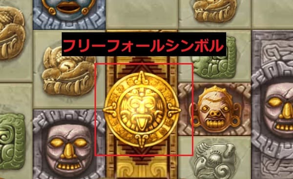 金の太陽円盤がフリーフォール(フリースピン)シンボルです。 画面上のどこに出現しても有効で、3つ以上出現するとフリースピンを獲得できます。