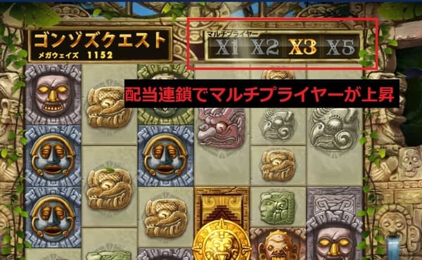 通常ゲーム中はアバランチ(連鎖)のたびにx1→x2→x3→x4→x5と上昇します。フリースピン中はx3→x6→x9→x12→x15まで上昇し、通常の3倍の倍率が適用されます。