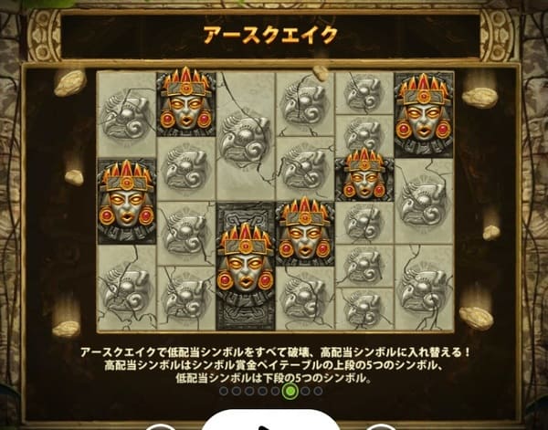 アースクエイクが発動すると画面が揺れ、石板シンボル(低配当)が仮面シンボル(高配当)に一斉に変化します。 これにより、高配当シンボルだけで構成されたリールから大量のウェイが成立し、巨額の配当が生まれます。