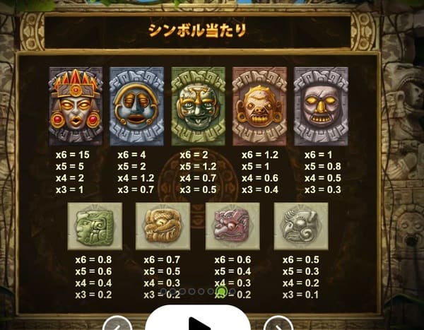 高配当シンボルは古代文明の仮面の形をしたシンボルです。$1ベット時・6個揃い(最大ウェイ)の配当は以下の通りです。