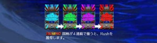 RESPINシンボルが出現したら期待感UPです。 リスピンが1回来ただけでは終わりません。2回、3回と連鎖する可能性があり、4連続でRUSH突入です。 リスピンが来たらRUSH突入のチャンスと考えて、期待しながらプレイしましょう。