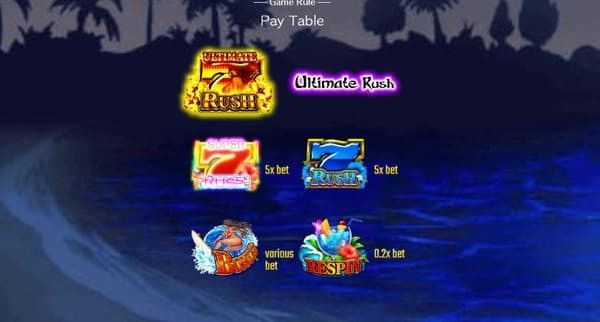 最上位のRUSHモードです。金7(Ultimate Rushシンボル)が3つ揃うことで突入します。 Ultimate RUSH中は大量配当のチャンスが最も高く、ハワイアンドリームの最大配当1,400倍はこのモードで実現します。 出現率は低いものの、突入すれば大きなリターンが期待できる、まさに「夢」のモードです。
