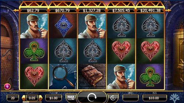 5リール×3段のリール構成で、20本のペイラインを搭載しています。 画面上部に表示される5つのプログレッシブジャックポットが最大の特徴で、フリースピン中に同じ色のダイヤモンドを5つ集めると該当するジャックポットを獲得できます。 シンボルにはホームズ・ワトソン・虫眼鏡・本に加え、トランプのスーツ(スペード・ハート・クラブ・ダイヤ)が使われています。