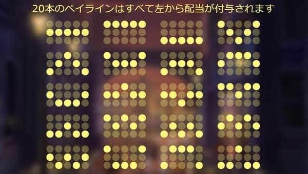 20本のペイラインはすべて左からの配当です。同一シンボルが左端リールから3個以上連続して出現すると配当が成立します。