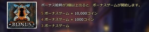 ボーナスシンボルが3つ以上出現するとボーナスゲームに突入します。3つでボーナスゲームのみ、4つで+1,000コイン、5つで+10,000コインが加算されます。