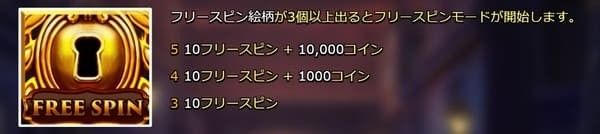 フリースピンシンボルが3つ以上出現すると10回のフリースピンが付与されます。4つで+1,000コイン、5つで+10,000コインのボーナスも加算されます。