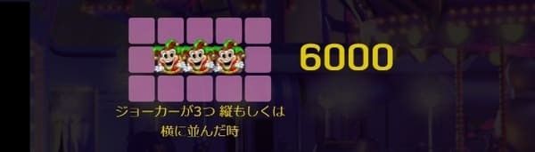 最大6,000倍です。ジョーカーシンボルが3つ縦または横に一列に並ぶと、6,000コインの最大配当が獲得できます。