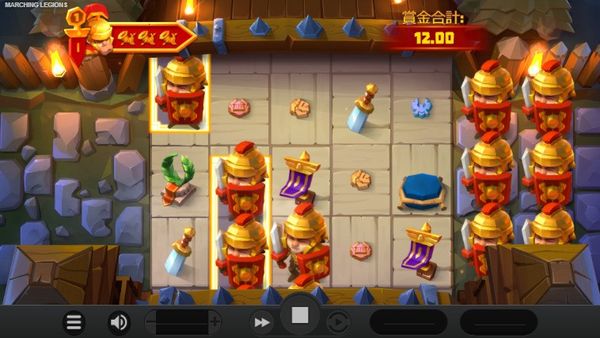 マーチング機能(ローマ兵士がリールを行進) — ローマ兵士シンボルがリール上を右から左へ行進し、行進中に配当が成立すると賞金に加算されます。