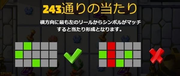 5リール×3段のリール構成で、243ウェイズの配当方式を採用しています。 隣接するリールに同一シンボルが左から並ぶことで配当が成立する、分かりやすいゲーム性が特徴です。