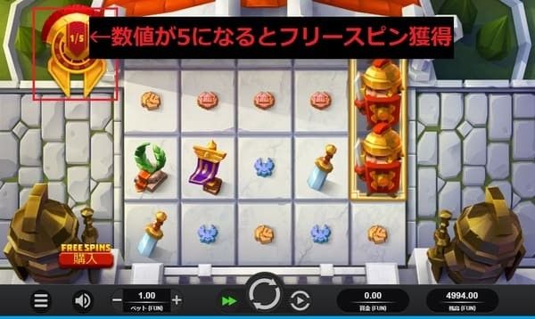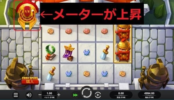 画面左上に表示されるメダル型のレギオンメーターがもう一つの重要な機能です。 特定の条件を満たすことでメーターがチャージされ、1/5→2/5→3/5→4/5→5/5と段階的に上昇していきます。 メーターが5/5に達すると、フリースピンが自動的に発動します。