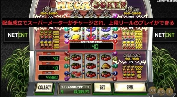 スーパーメーターモードは、メガジョーカーの核心となる機能です。 下段ベーシックモードで配当が成立すると、獲得した賞金がスーパーメーターにチャージされ、上段リールでのプレイが可能になります。