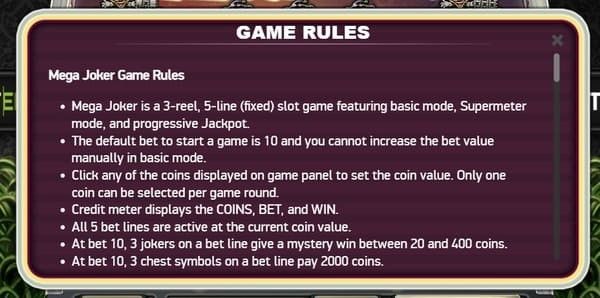 メガジョーカーはクラシックなフルーツマシンのデザインを忠実に再現しています。ジョーカーシンボルが最高配当で、3つ揃うと大きな賞金を獲得できます。 宝箱シンボルはベット10コイン時に最大2,000コインの配当が得られる特殊シンボルです。