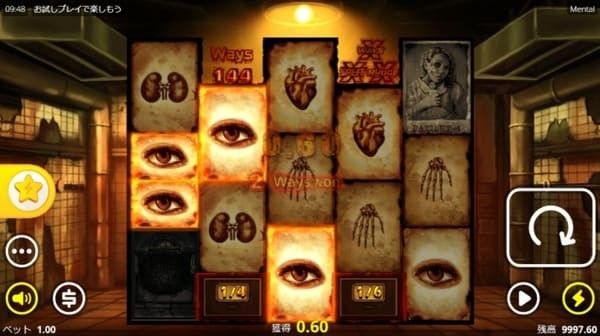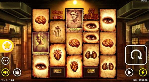 メンタルのシンボルは患者キャラクター(高配当)と臓器シンボル(低配当)に分かれています。ダークなテーマに合わせたグロテスクなデザインが特徴です。