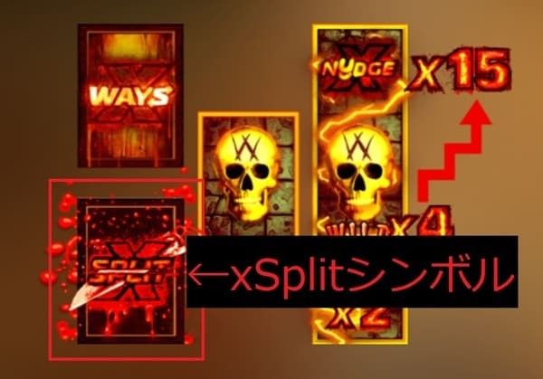 xSplitは、血塗られた特殊シンボルが着地すると、そのリール上のすべてのシンボルを2つに分裂させる機能です。 xWaysと同様にウェイズ数が増加しますが、xSplitは既に存在するシンボルを分割するため、xWaysと組み合わさると効果が倍増します。 ワイルドシンボルもxSplitで分裂するため、マルチプライヤー付きワイルドが2つになるという強力な効果を発揮します。