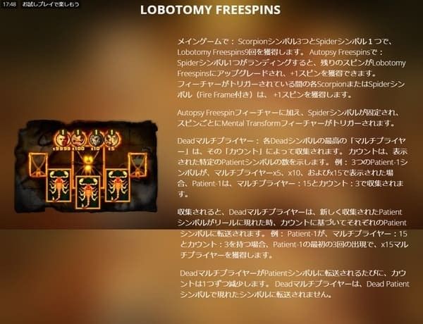 Autopsy Freespinsが基本のFS、Lobotomy FreespinsがSpiderシンボルのスティッキーWild化を含む上位版、Mental TransformがLobotomy中に発動する最も強力なフィーチャーです。上位ほどDeadマルチプライヤーの蓄積と転送が強力になります。