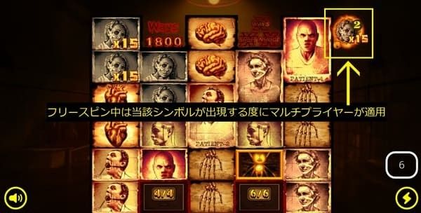 Lobotomy FS中のMental Transformでは、Deadマルチプライヤーが蓄積されPatientシンボルに転送されます。 蓄積が大きくなるほど1回の配当が巨大になるため、フリースピンの残り回数と蓄積状況を意識しながらプレイしましょう。