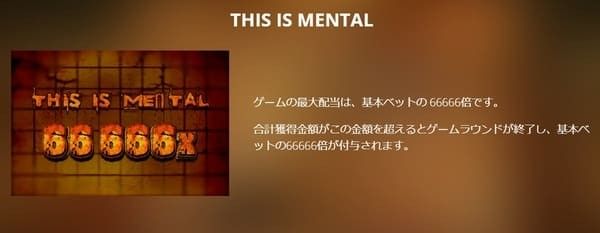 メンタルの基本スペックを一覧でまとめました。RTP96.08%、最大66,666倍の爆発力を持つ超高ボラティリティスロットです。