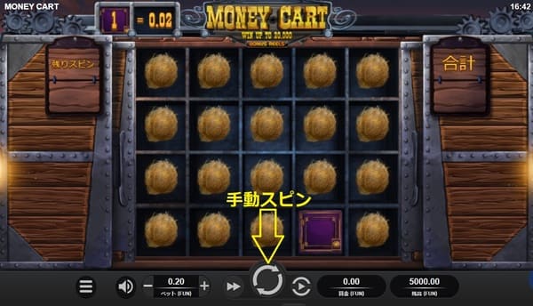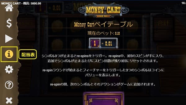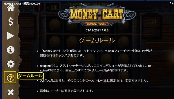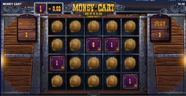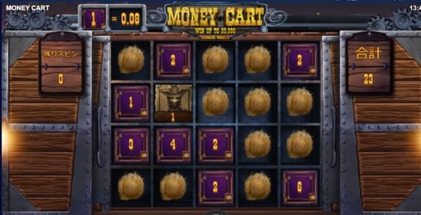 マネーカートは5列4段のスロットマシンで、Re-Spinフィーチャー中に追加で2列が開放されるチャンスがあります。 通常のスロットとは異なり、ベースゲームは存在しません。毎スピンでコインシンボルの出現を狙います。