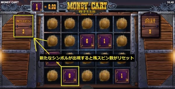 新しいコインシンボルが出現すると、残りスピン回数が3回にリセットされます。 これがマネーカートの鍵で、コインが次々と出現すればRe-Spinが長く続き、バリューが積み上がっていきます。