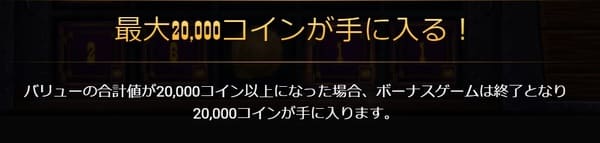最大20,000倍(コイン)です。コインバリューの合計が20,000に達するとボーナスゲームが終了し、20,000コインが支払われます。