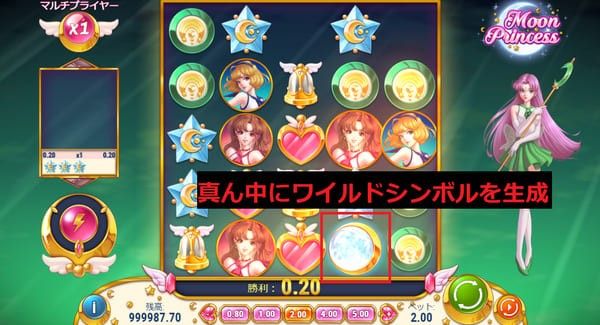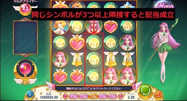 月のシンボルがワイルドで、すべてのシンボルの代わりになります。 主にSTARのガールパワーで生成され、隣接する複数の配当ラインに同時に貢献できるため、連鎖を大きく伸ばす鍵となります。
