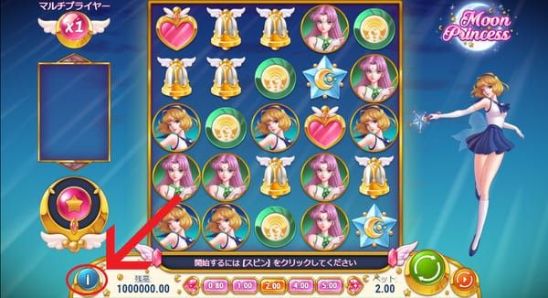 画面左下の「i」ボタンをタップすると、配当表やゲームルールを確認できます。 初めてプレイする際は、まず配当表を確認して各シンボルの価値を把握しておきましょう。