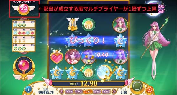連鎖するたびにマルチプライヤーが+1ずつ上昇します。 1連鎖目はx1、2連鎖目はx2、3連鎖目はx3...と増加していきます。 マルチプライヤーは配当が途切れるとリセットされるため、連鎖が長く続くほど大きな配当に繋がります。